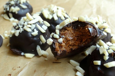 Извадете сместа от хладилника и с ръце оформете малки топки. Потопете в разтопения шоколад топчетата и с помощта на вилица оваляйте от всички страни. Поставете бонбоните върху пергаментова хартия. Отгоре поръсете с парченцата бадеми.