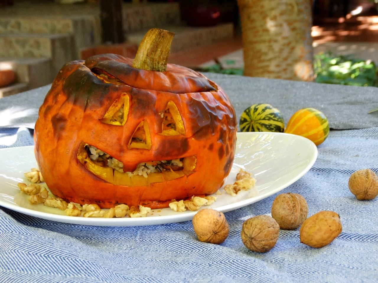 Напълнете тиквата с плънката. Поставете капачето отгоре. Покрийте тиквата с хартия за печене, за да не изгори. |