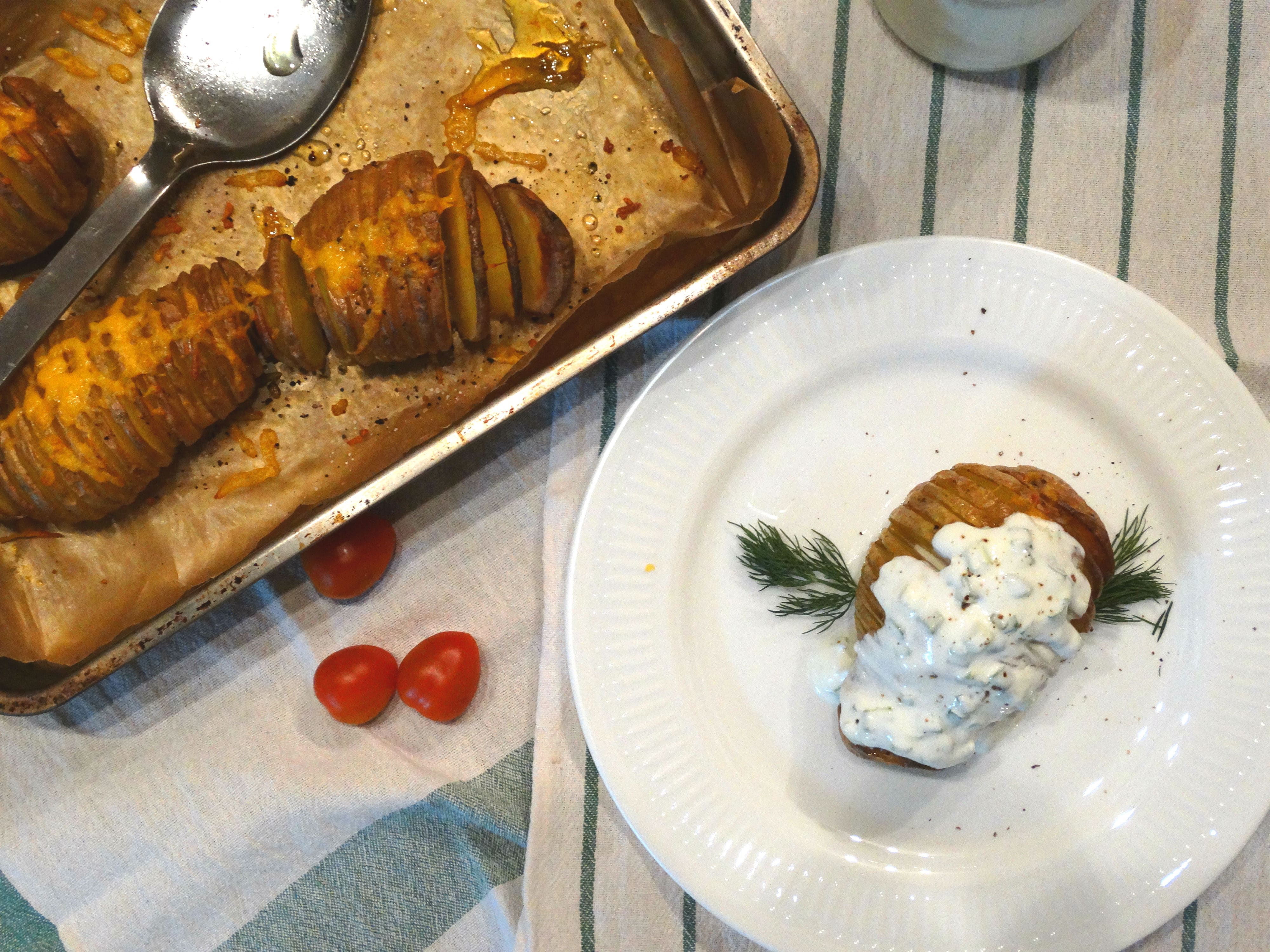 Измийте добре картофите. Направете прорези във всеки картоф на равни интервали почти до края на картофа, но без да го отрязвате. Може да си помагате с вилица. Като я забучите в картофа, правете прорезите между зъбците на вилицата. Овкусете със сол и черен пипер. Обтрийте картофите с масло, като сложите и в прорезите. |