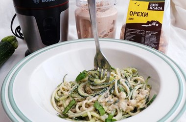Сложете ги в каната за мелене на ядки на блендер заедно с чесъна, сиренето, сока от лимон, бадемовата сметана и подправките. Овкусете със сол и черен пипер. Блендирайте за кратко. Отворете капака, оберете стените на каната и отново блендирайте. Ореховият сос е с сравнително гъст, като паста. |