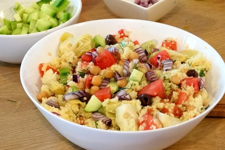 Сварете киноата или кус-куса според инструкциите на опаковката. За безглутенов вариант използвайте киноа. Щом се свари киноата, оставете настани да изстине добре. Прехвърелете в голяма купа за сервиране. |